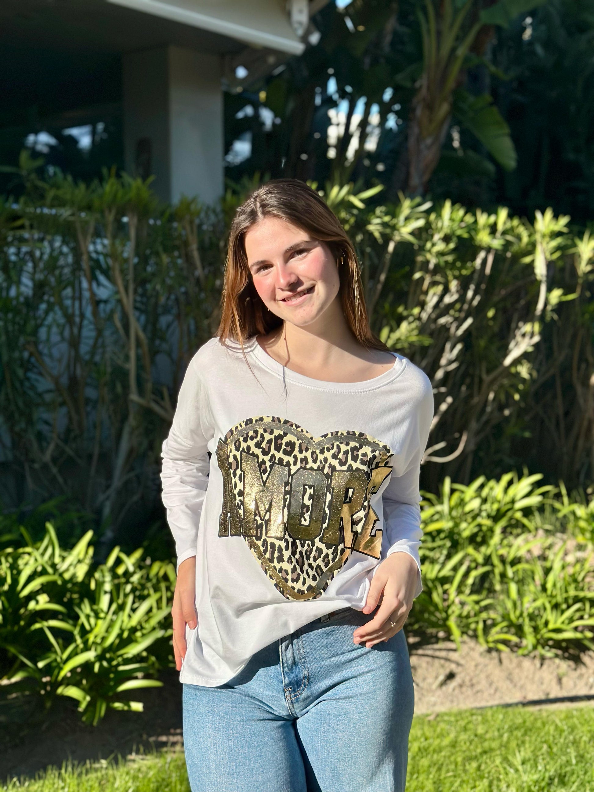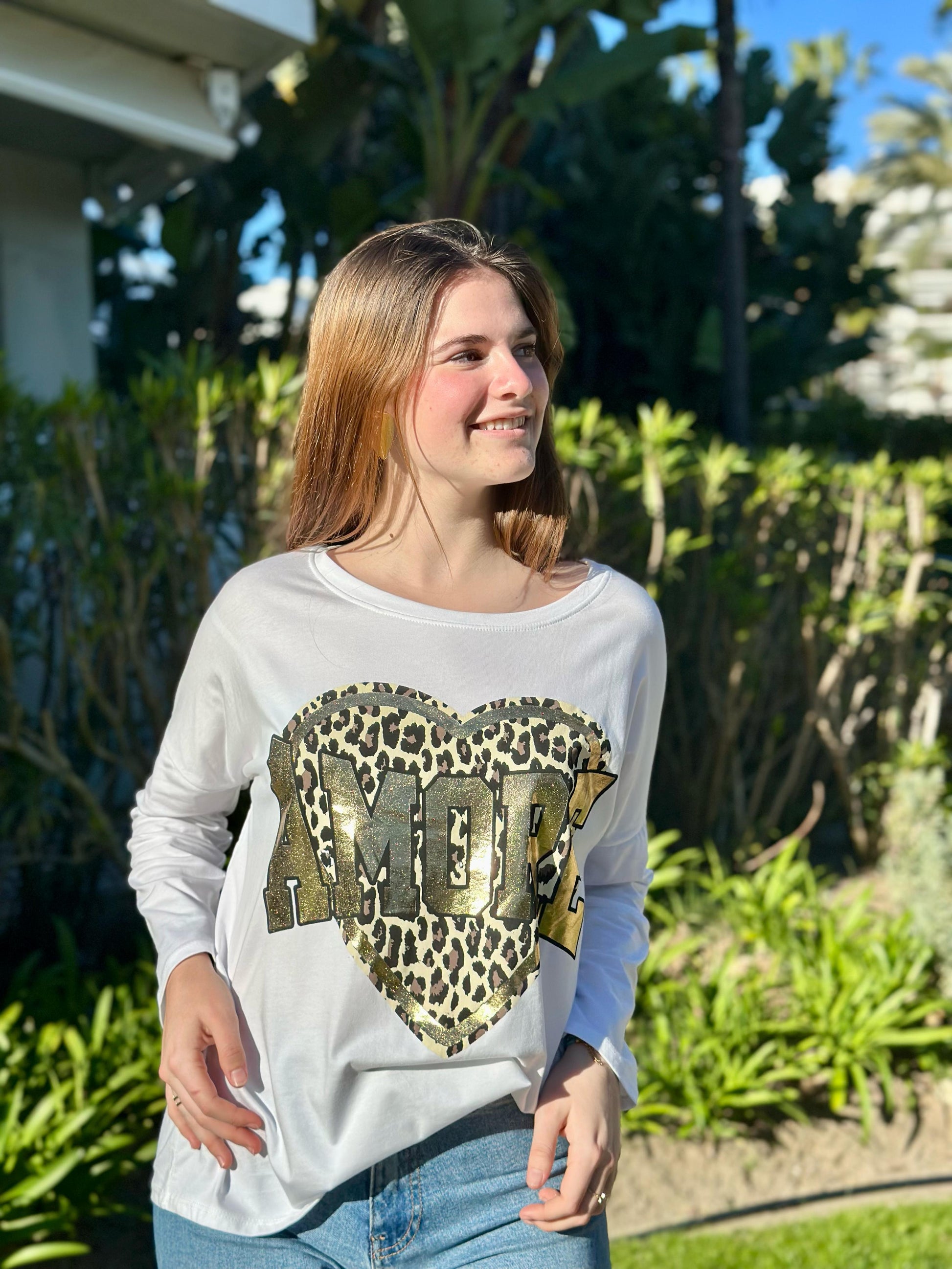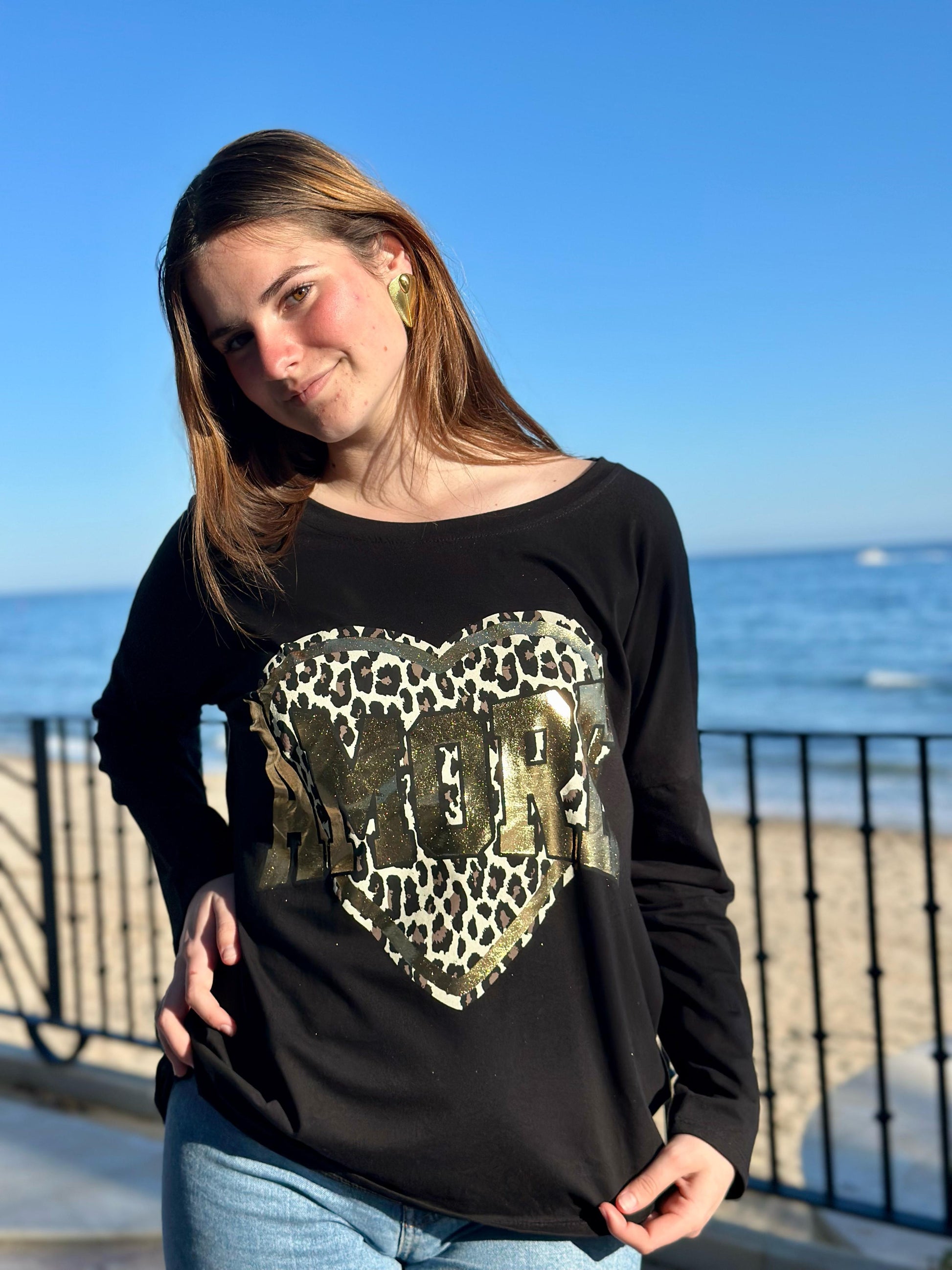 Camiseta manga larga cuello redondo, de color con estampado de corazón animal print
