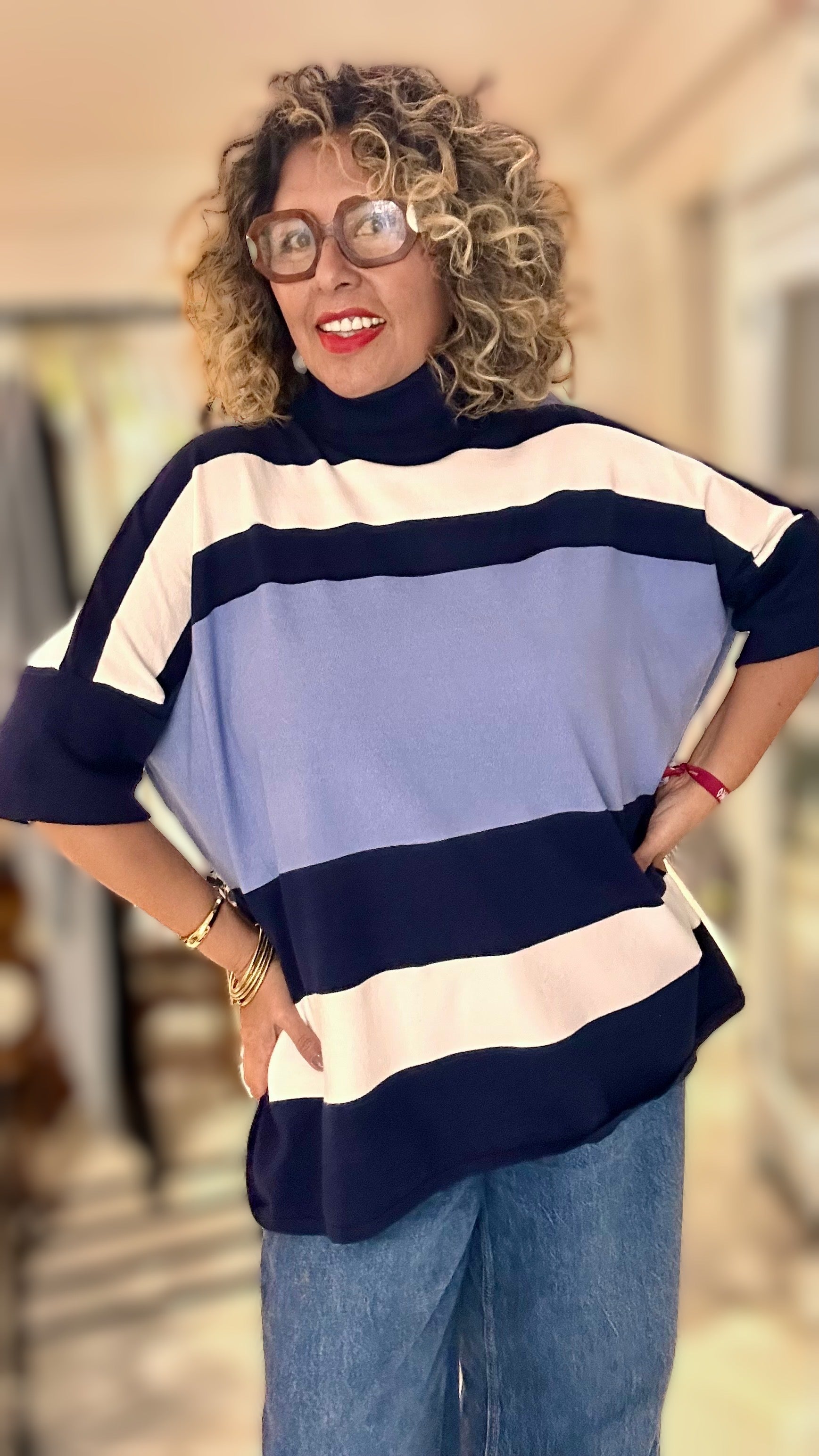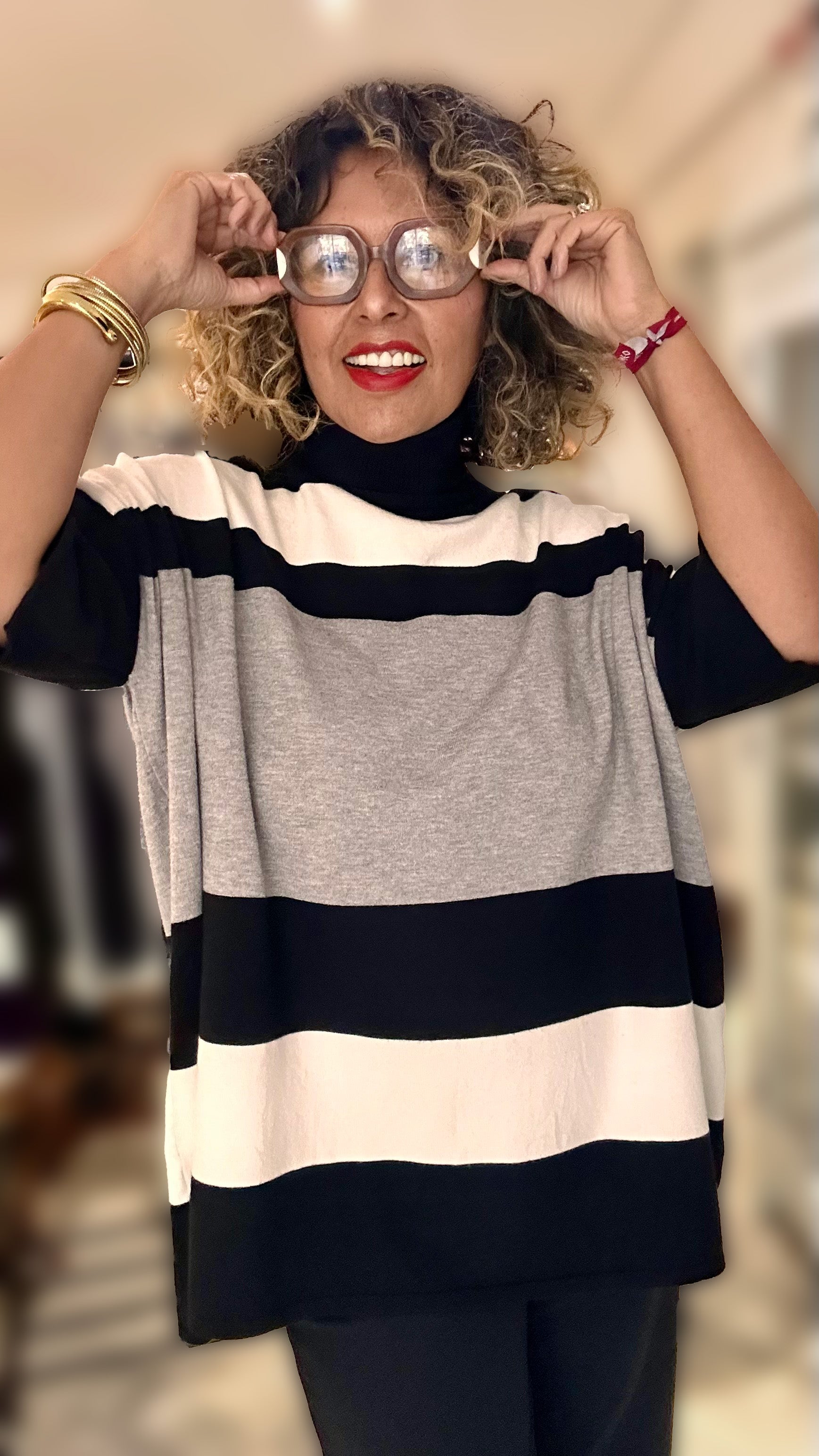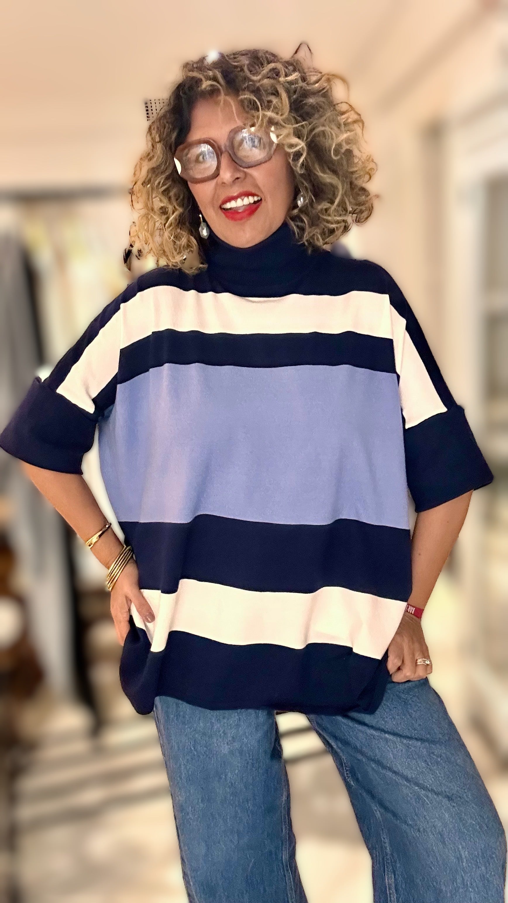 El Jersey Mirela combina rayas de colores y un cuello de cisne o tortuga para un estilo único. Perfecto para mantenerte abrigado mientras te destacas en Perú.
