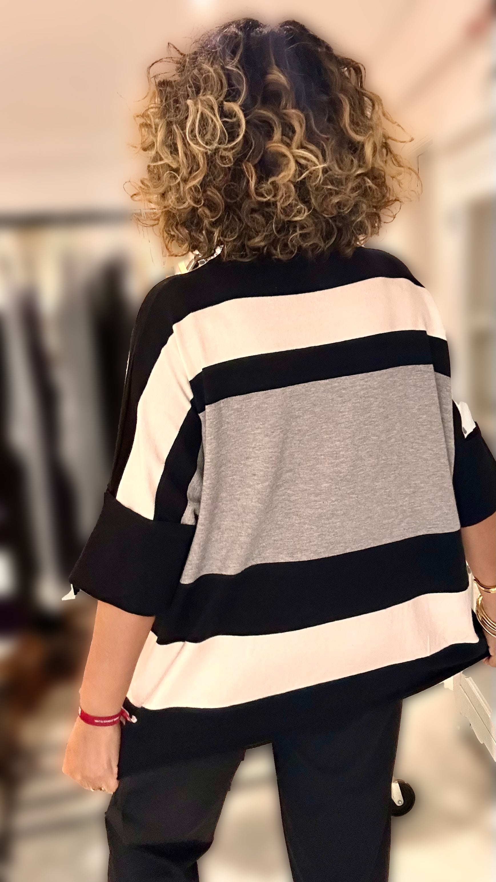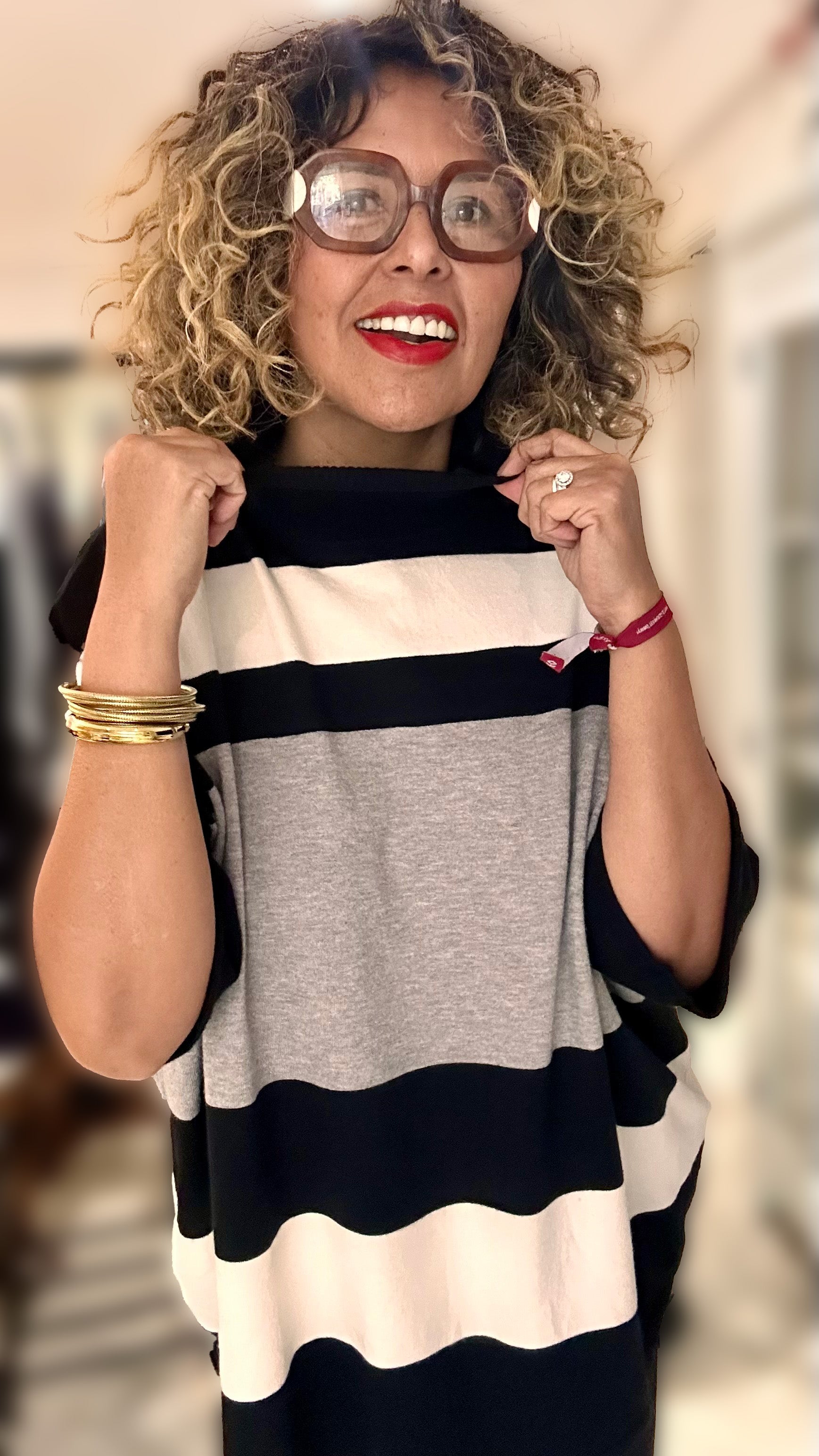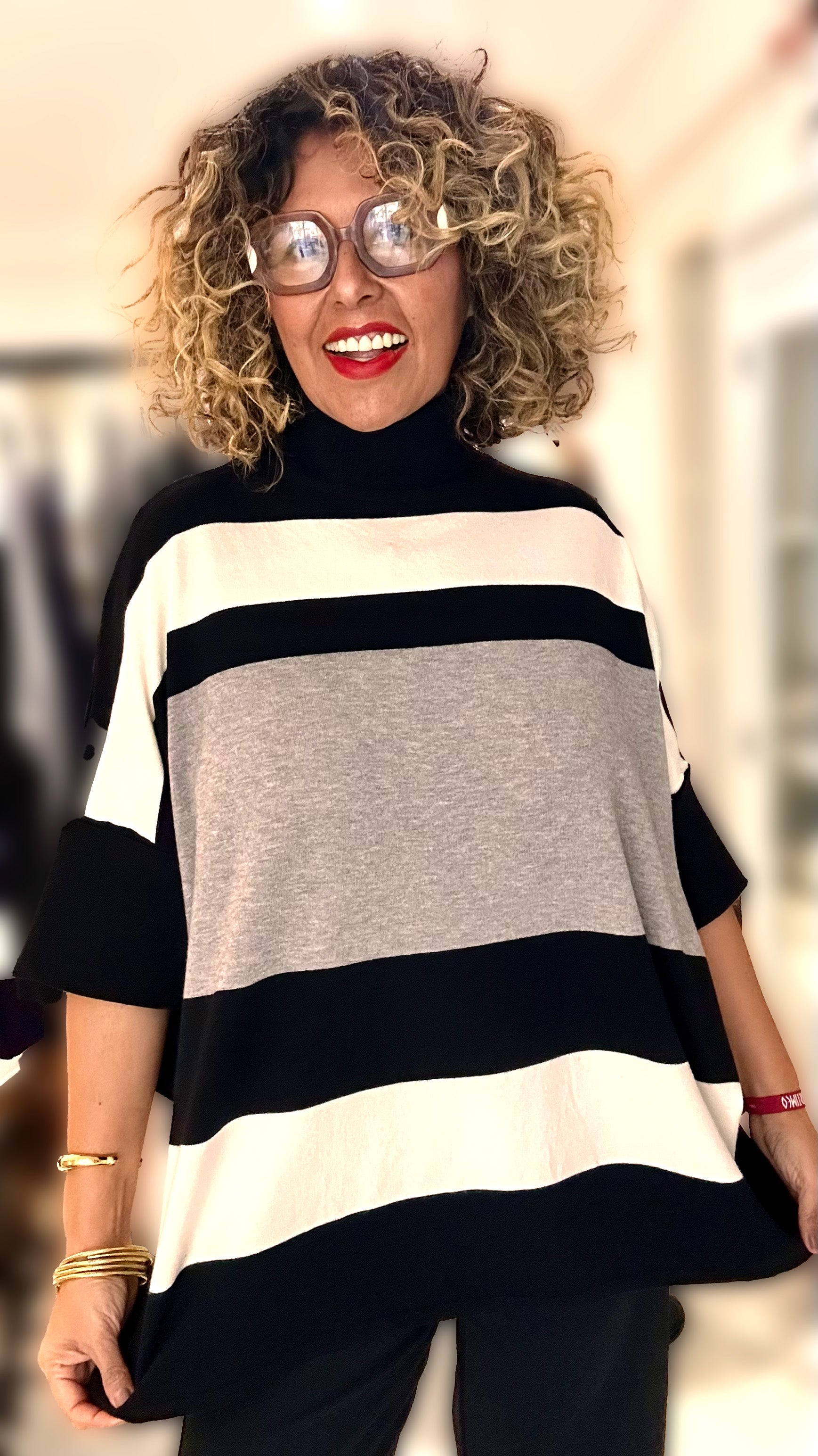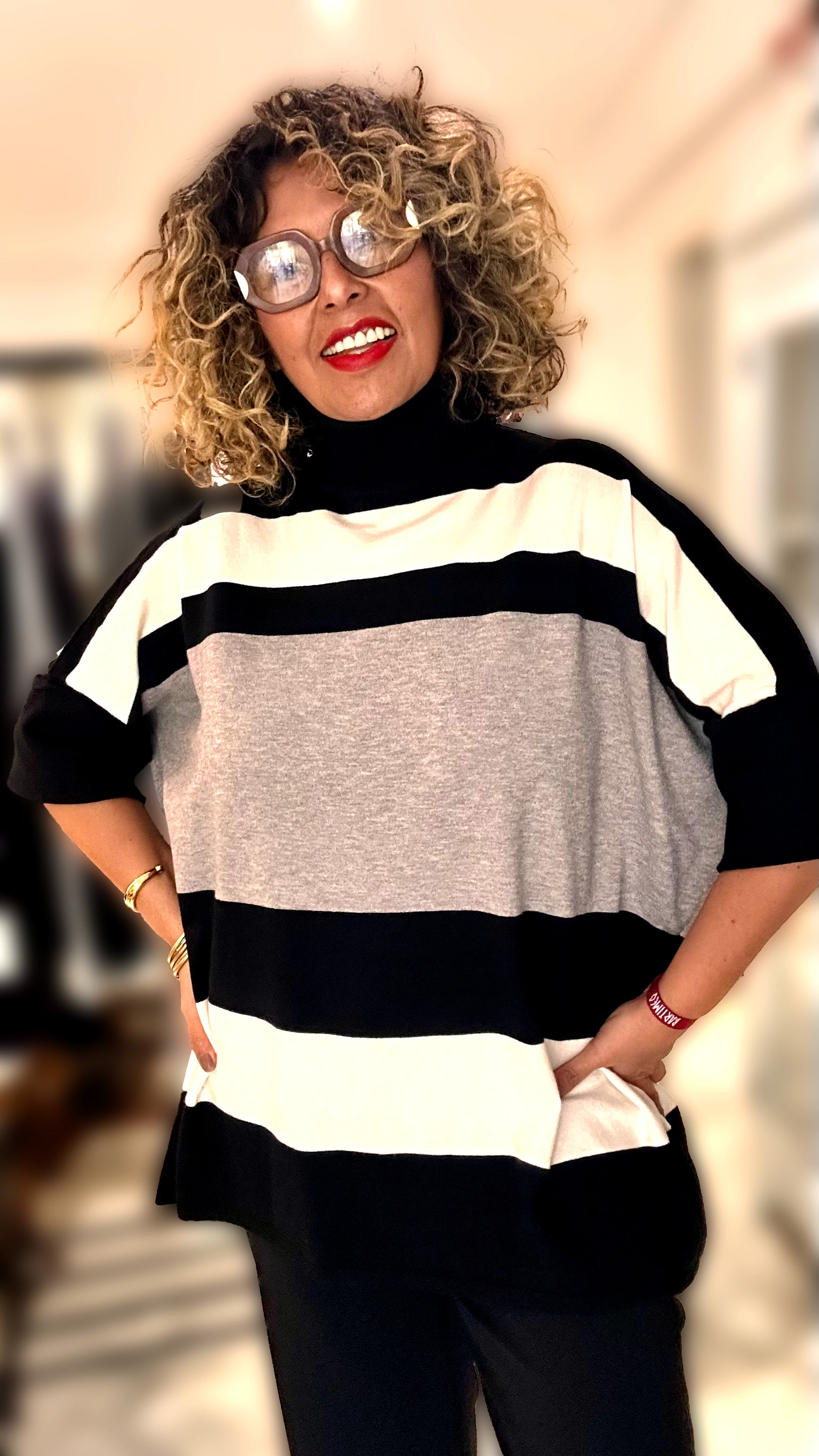 El Jersey Mirela combina rayas de colores y un cuello de cisne o tortuga para un estilo único. Perfecto para mantenerte abrigado mientras te destacas en Perú.