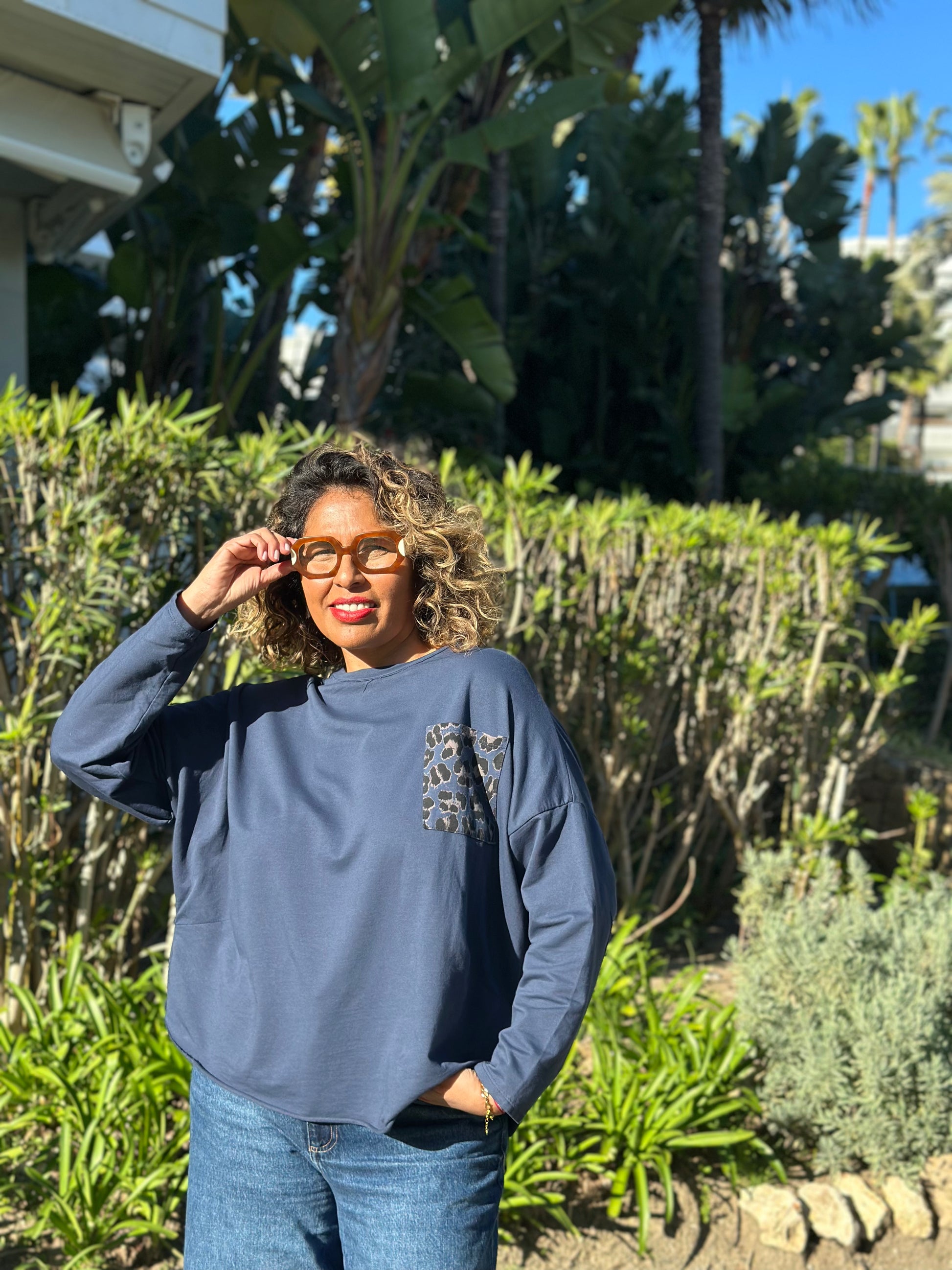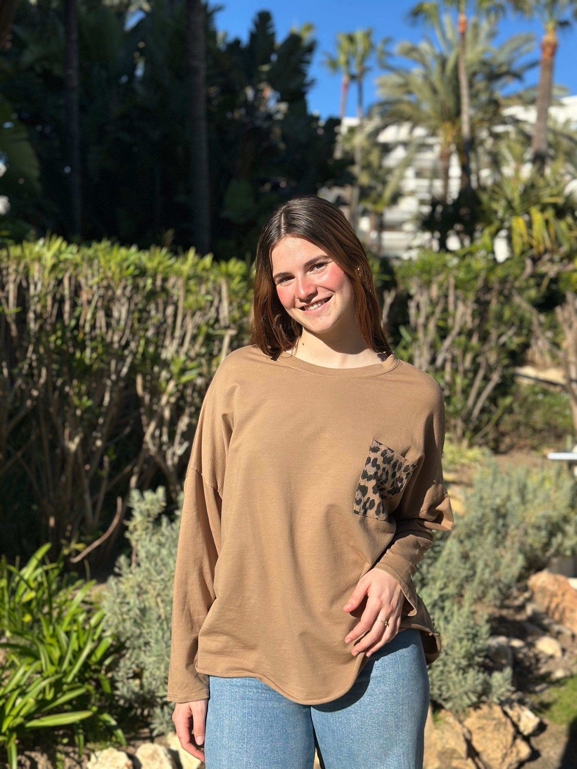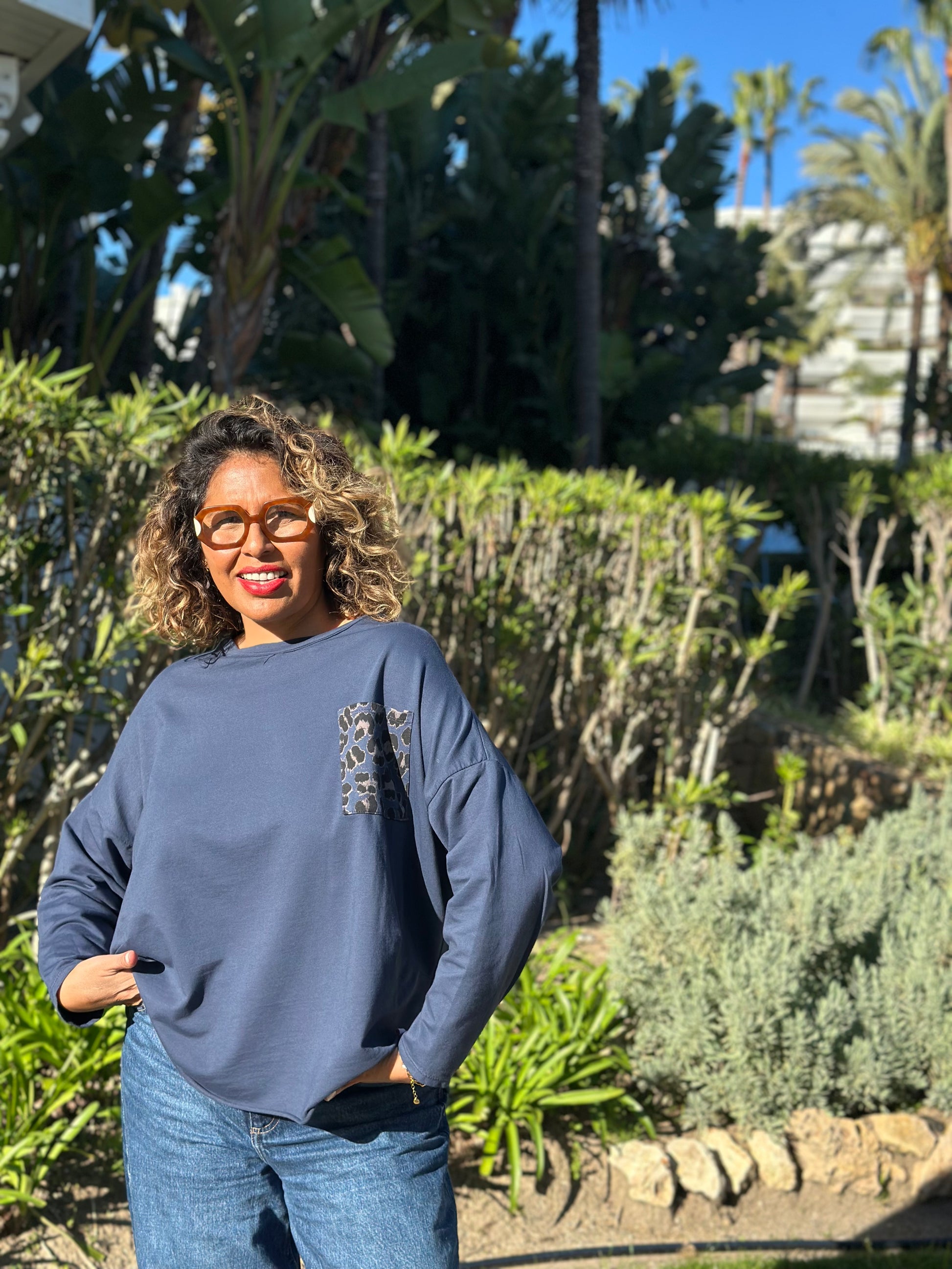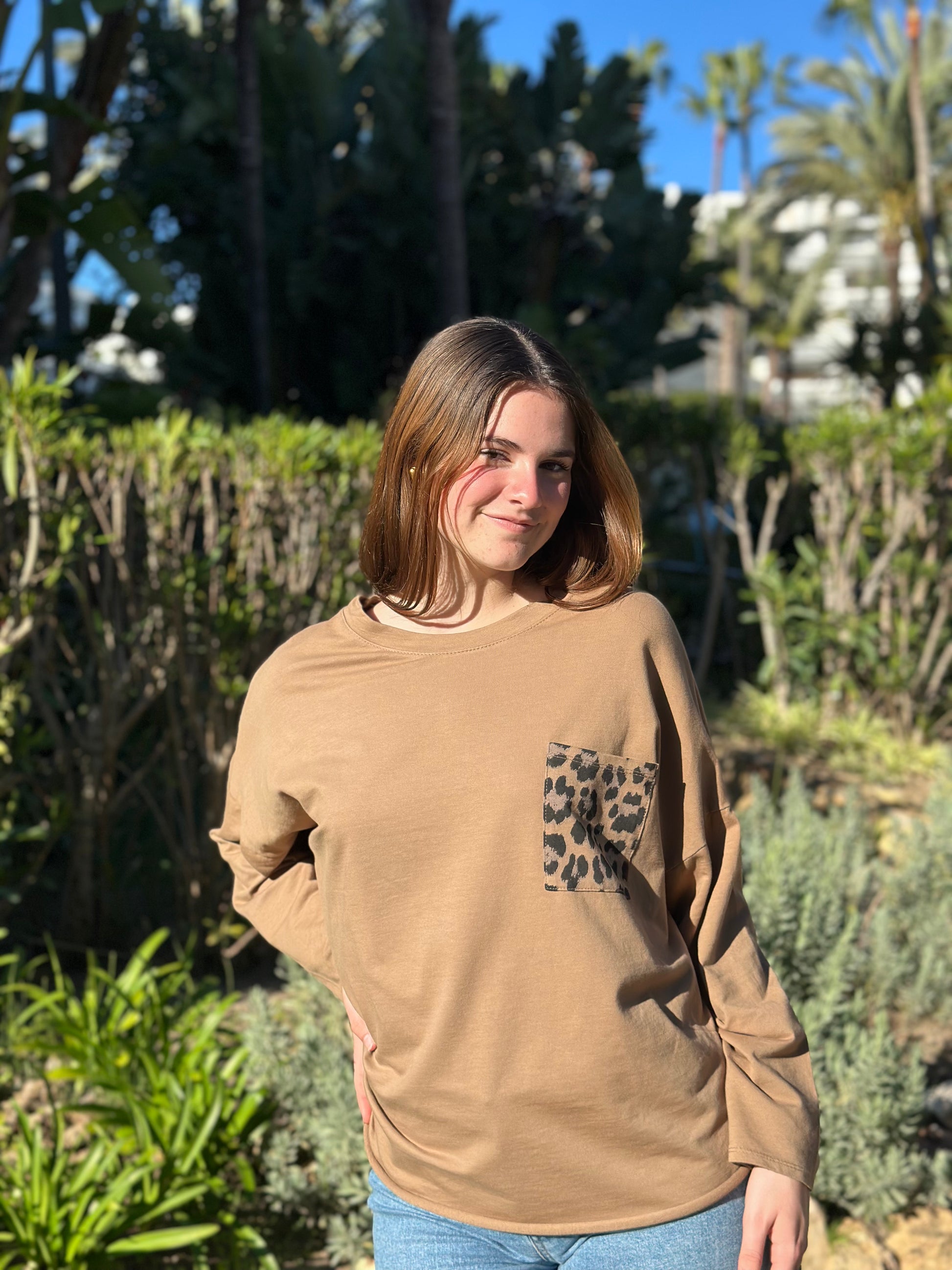 Sudadera cómoda y elegante con cuello redondo y manga larga. El detalle de bolsillo en animal print le da un toque moderno y sofisticado. ¡Ideal para un estilo urbano y a la moda en Perú!